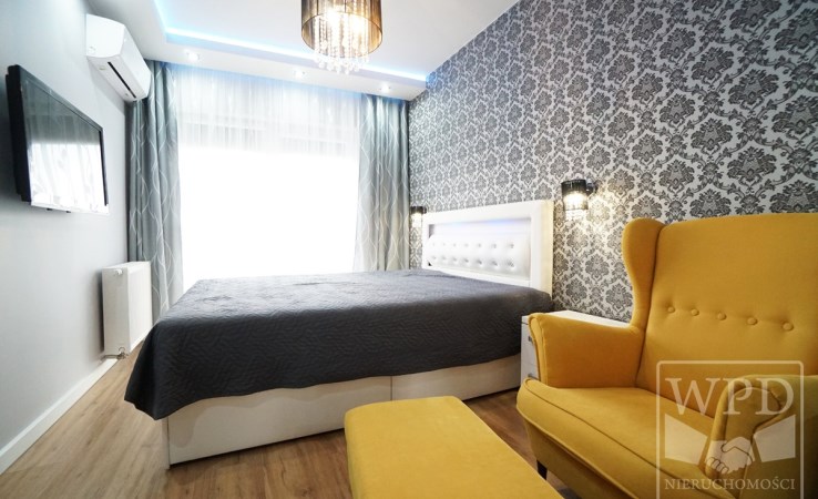 Przestronny apartament składa się z salonu połączonego z kuchnią, sypialni, garderoby, przedpokoju, łazienki oraz dużego balkonu. W pełni umeblowane i wyposażone m.in. telewizor, piekarnik, mikrofalówka, zmywarka, talerze, odkurzacz, deska do prasowania itd.